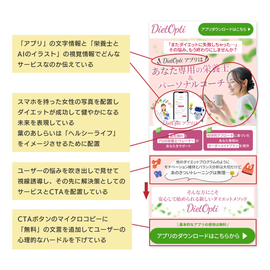 ファーストビューではダイエットの悩みを持つユーザーに対して、アプリを通じて解決するサービスを提供する旨を文字情報と視覚情報を使って、ぱっと見て伝わる構成・レイアウトとなるように工夫している。