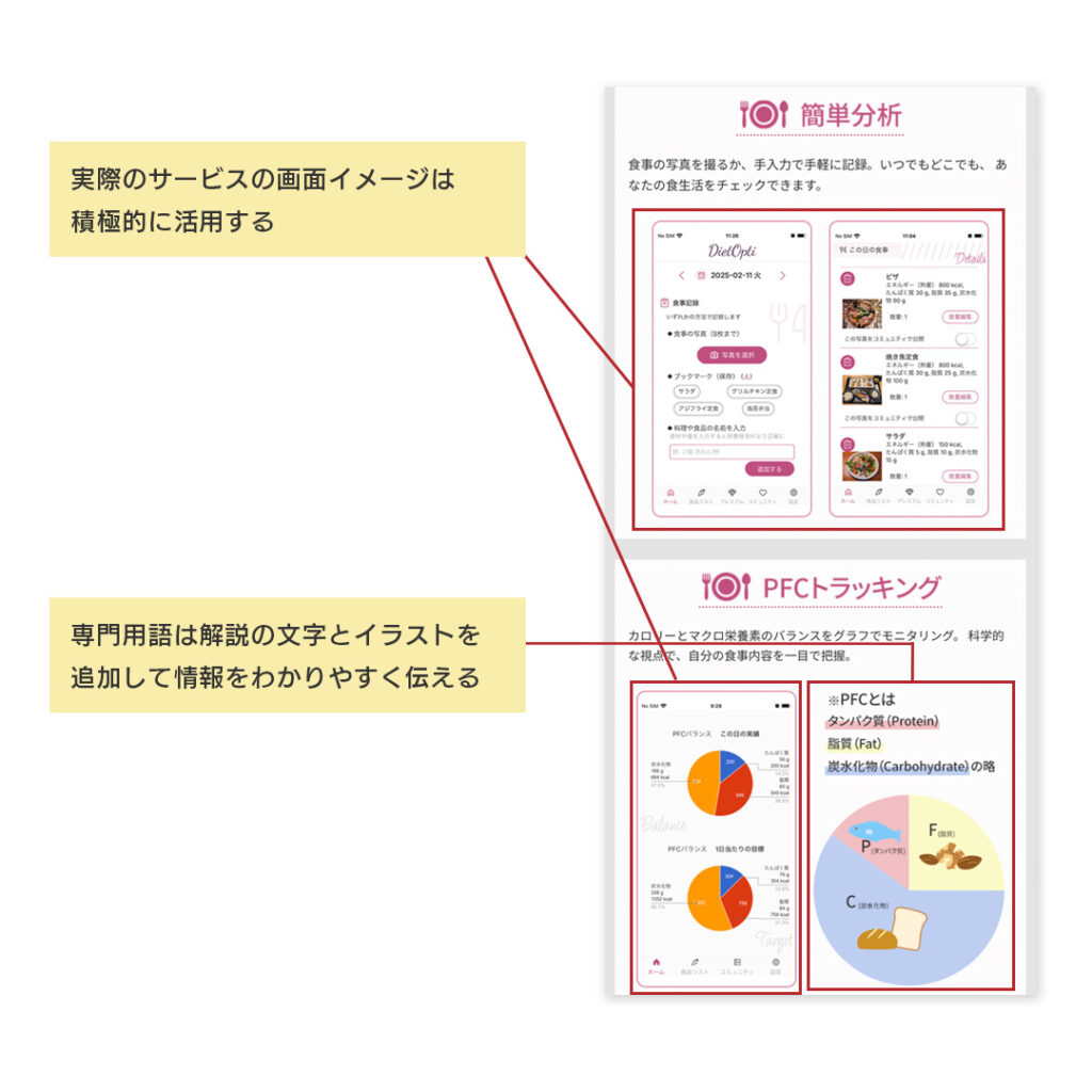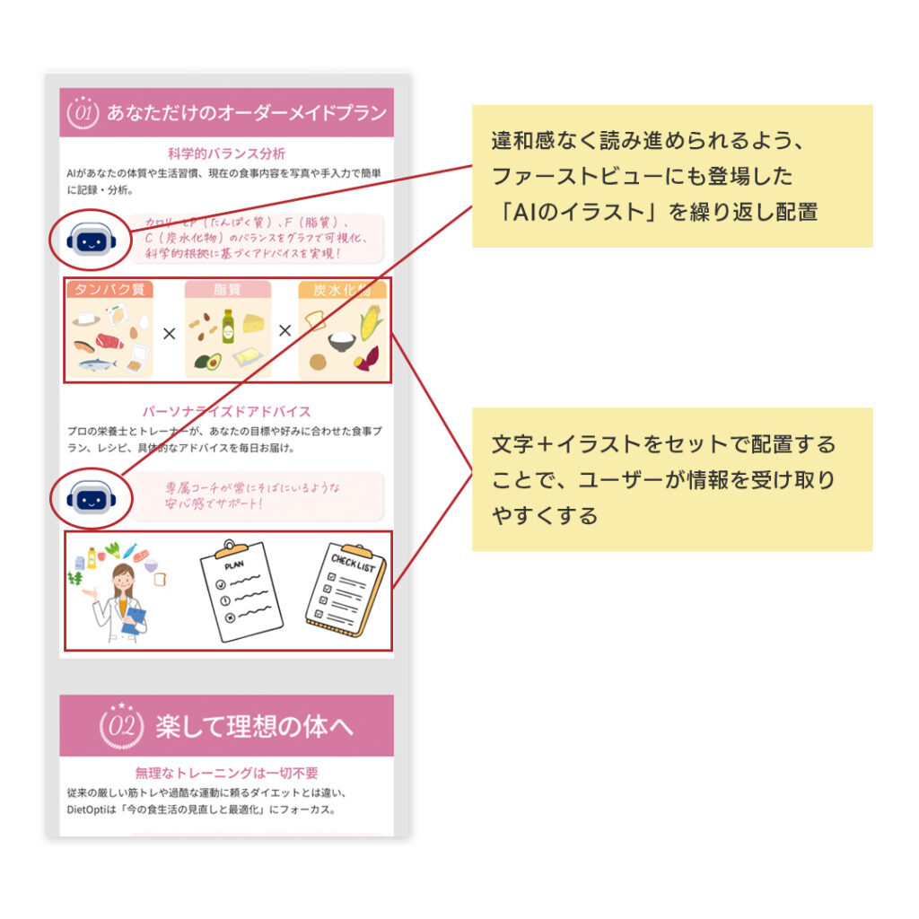 ユーザーの悩みを解決する根拠はしっかりと伝えなければならないが、情報量が多くても文字+イラストで受け取りやすくする。