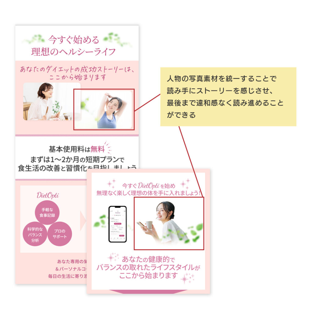オリジナルの写真素材が準備できない場合、素材サイトから探していくことになるが、今回はファーストビューで登場した女性の写真素材と同じ人物のものを繰り返し使用している。